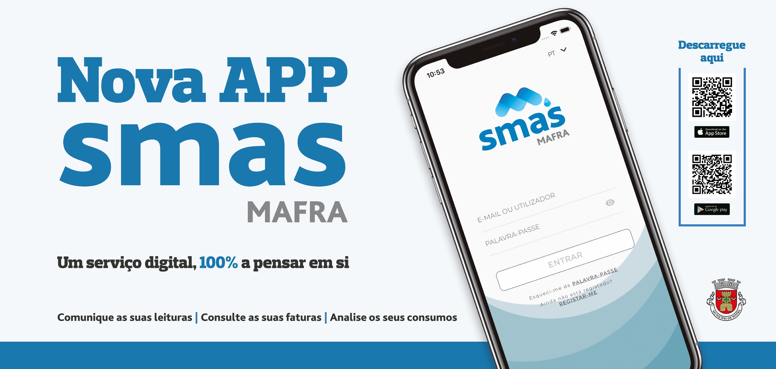 Os Serviços Municipalizados de Água e Saneamento de Mafra (SMAS de Mafra) têm um novo serviço digital, 100% a pensar em si. Trata-se de uma aplicação para telemóvel (app) que permite, de forma simples e rápida, comunicar leituras, consultar faturas e analisar consumos, evitando deslocações aos serviços de atendimento. A app pode ser descarregada, gratuitamente, na App Store ou na Google Play, conforme o sistema operativo do seu telemóvel. Se já está registado no balcão digital dos SMAS de Mafra, não necessita efetuar novo registo na app. Deverá utilizar as mesmas credenciais (utilizador e palavra-passe). Caso pretenda associar novos contratos às suas credenciais ou ativar associações pendentes, deverá realizá-lo através do balcão digital.